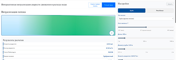 Физическая интерактивная модель отражающая скорость и расход воды при ее движении в трубах, реках и каналах, возможность расчета расхода воды и ее скорости при использовании насосов различной мощности